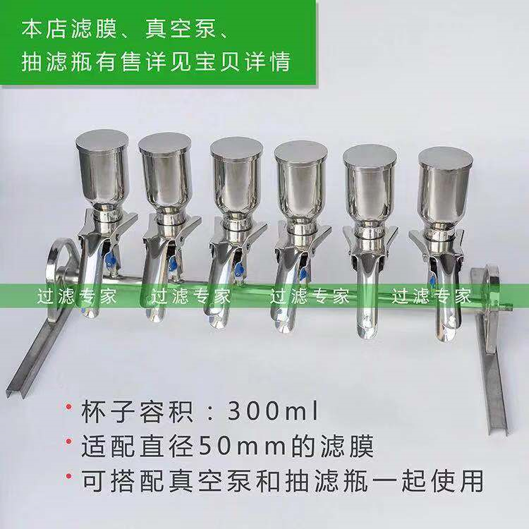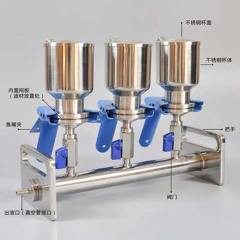 不銹鋼多聯(lián)杯式過(guò)濾器是一種應(yīng)用于化學(xué)實(shí)驗(yàn)室中的溶液過(guò)濾裝置。目前,國(guó)內(nèi)實(shí)驗(yàn)室在對(duì)溶液進(jìn)行過(guò)濾時(shí),一般采用玻璃材質(zhì)砂芯過(guò)濾裝置,這種方法每次只能過(guò)濾一個(gè)樣品,過(guò)濾速度慢,效率低,人工勞動(dòng)強(qiáng)度大。同時(shí)玻璃材質(zhì)易碎不易高溫消毒。本儀器的目的是為了一次同時(shí)對(duì)多個(gè)樣品進(jìn)行過(guò)濾,提高實(shí)驗(yàn)工作效率。同316L衛(wèi)生級(jí)不銹鋼材質(zhì)耐酸堿,耐腐蝕,易于高溫消毒,使分析結(jié)果更加穩(wěn)定可靠。